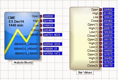 Figure 1 above shows the block with open, high, low, close and VWAP for the current daily bar of the December ES market. It also shows the Bollinger Bands technical indicator added to the block.