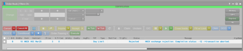 - The Order Book and Orders and Fills widget (OFW) now display rejected orders for the current session. A new “Message” column can optionally be exposed that displays the same reject message text displayed in the Audit Trail. The Message column supports filtering/searching on the message text string. A new quick filter button named “Rejected” displays in the top upper right portion of the Order Book, that when clicked applies a filter to only show rejected orders. Also as part of this work, in the Order Book Settings you can also customize the row color for rejected orders.