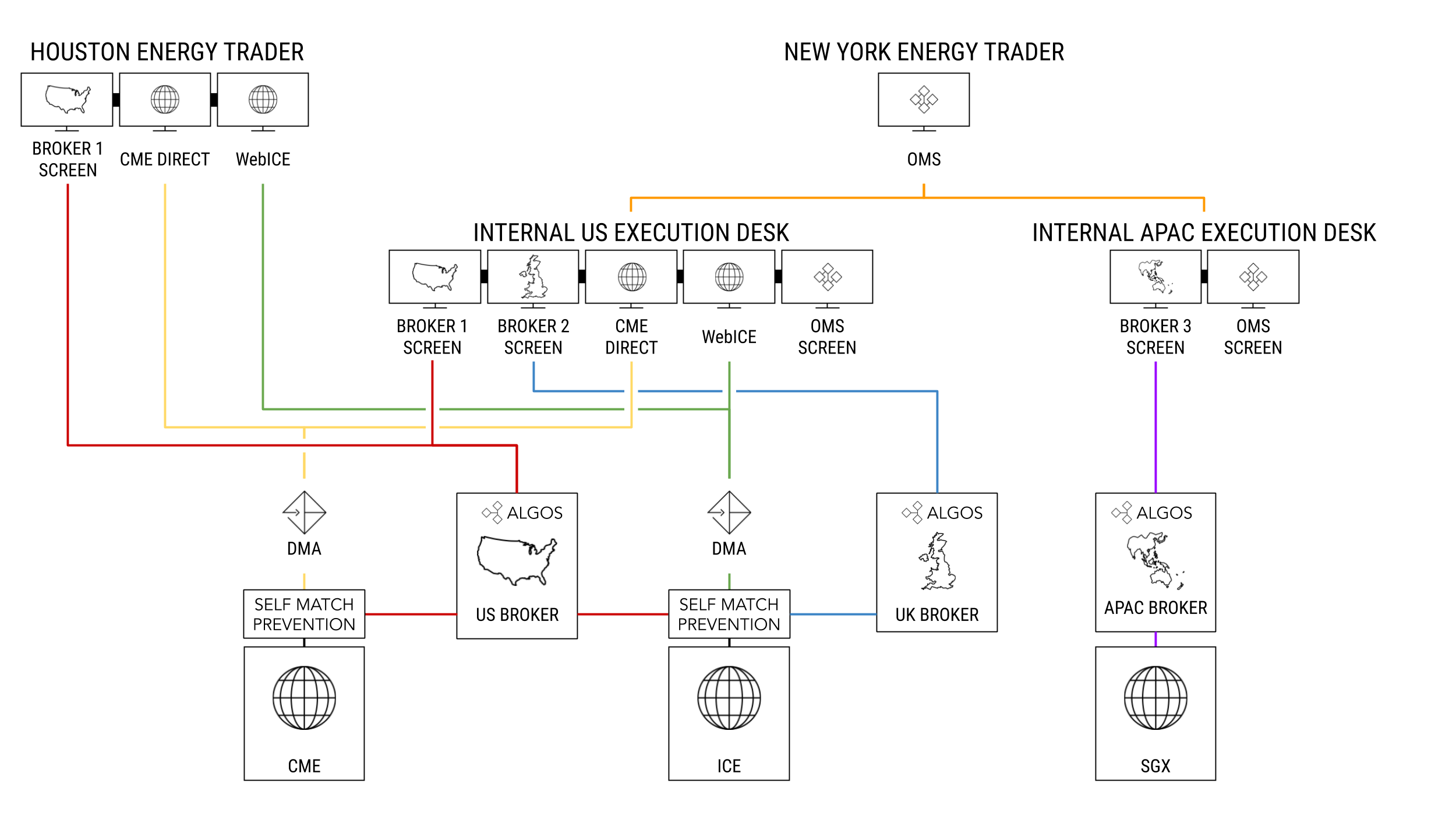 One of our customers is a leading global commodities trading firm with nearly 100 traders in multiple offices around the world. In addition to Trading Technologies, they used Fidessa, CQG, WebICE and LMESelect, and they have four FCM relationships to trade primarily crude and metals products on CME, ICE, LME, SGX, TOCOM and other derivatives exchanges. This trading firm had two primary goals. First, they wanted to reduce the complexity and cost of their IT infrastructure by consolidating trading platforms. Second, they wanted to improve the quality of their executions by centralizing order flow through execution desks, allowing execution specialists to fulfill orders, while at the same time minimizing execution fees.