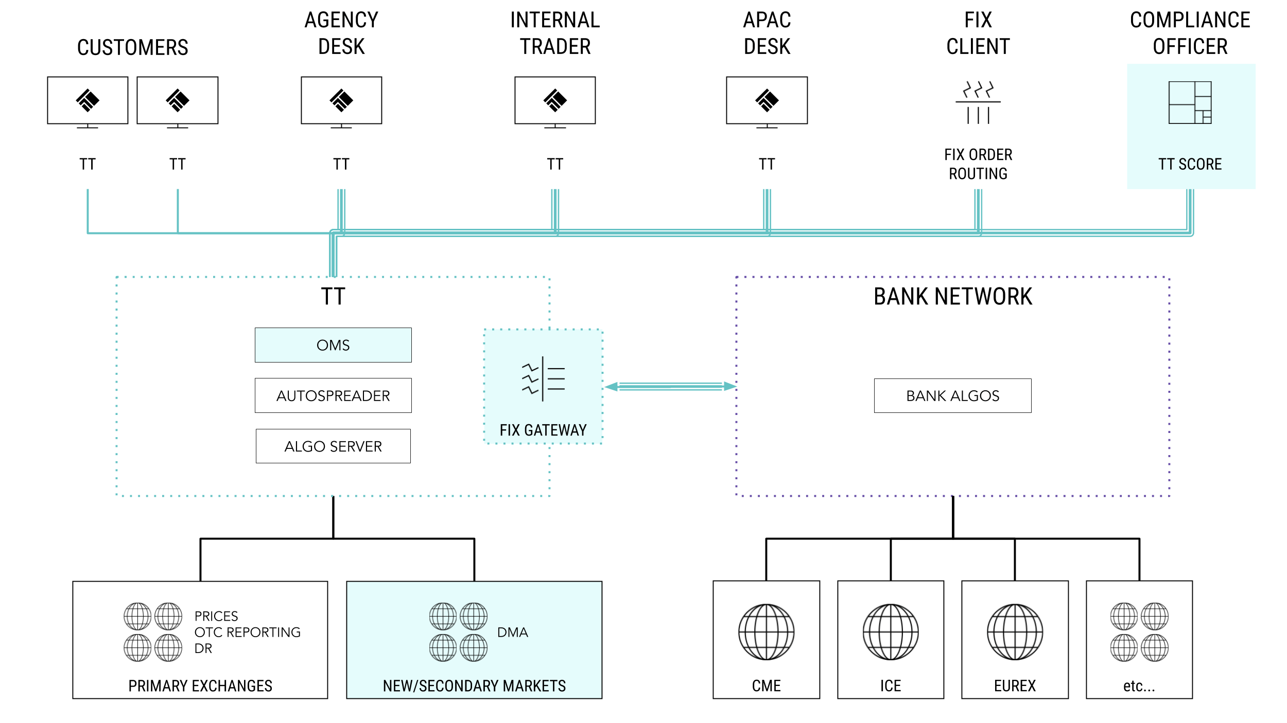 With our open architecture, we were able to offer a hybrid solution that leveraged the bank’s existing exchange connectivity and provided access to additional markets via our global network. Our FIX Order Gateway easily extends TT and seamlessly routes orders from our network using the bank’s native DMA. We also are able to offer OTC reporting and DR capabilities for those same markets using our market connectivity. We provide the market data for all markets so the bank only needs to maintain order connectivity on its end.