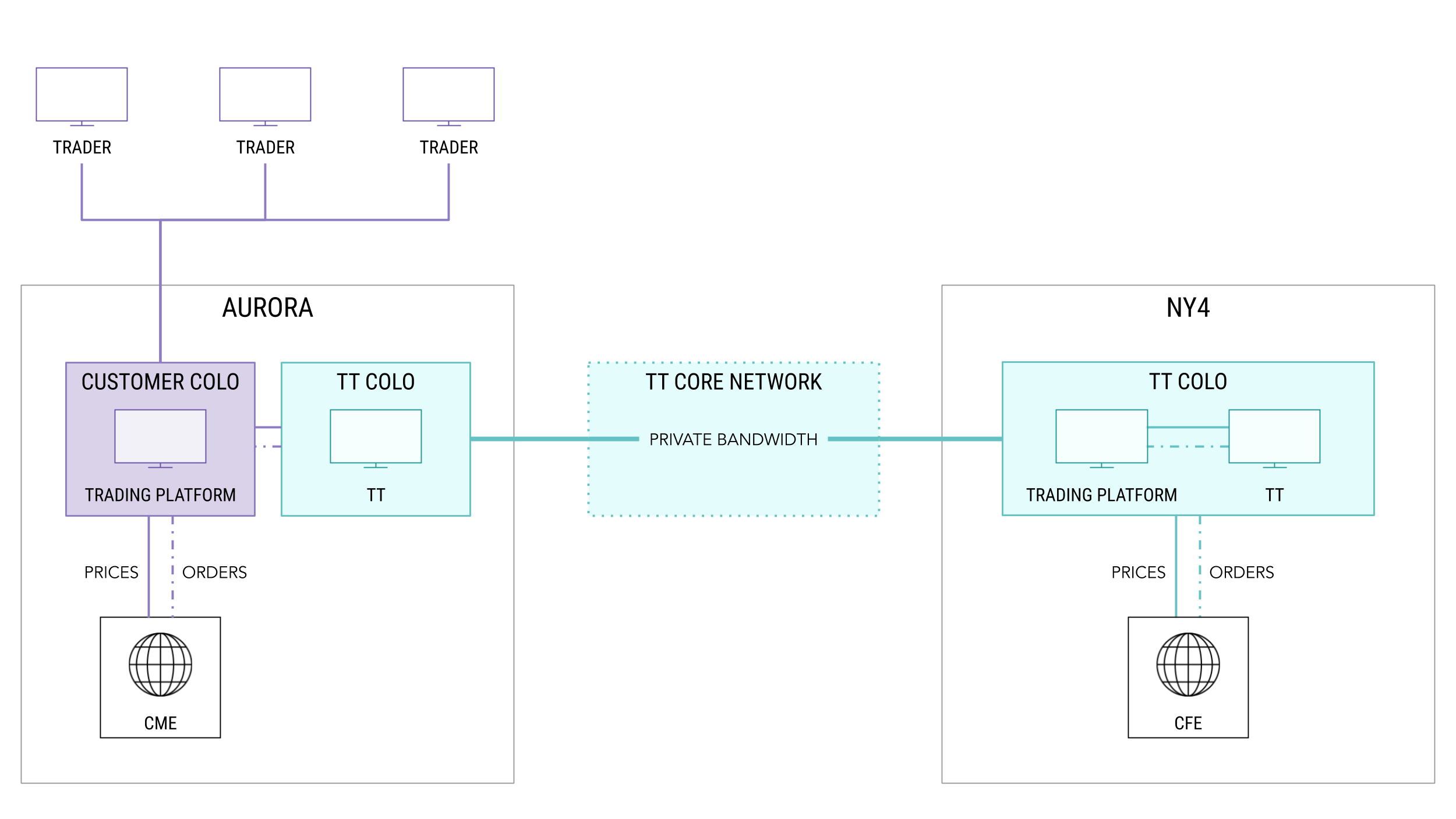 A proprietary trading group in Chicago developed their own low-latency trading platform specific to their needs and style of trading. They had used the platform exclusively to trade products on CME and deploy their system in CME’s colocation facility in Aurora. They had ideas for using their platform to try out new trading strategies on other exchanges, specifically the Cboe Futures Exchange (CFE), but they didn’t want to invest a great deal of money procuring data center space, IT infrastructure and connectivity to test out their strategies in these unproven markets. They were looking for a solution that didn’t require a big upfront capital investment or long-term commitment so they could test out their ideas.