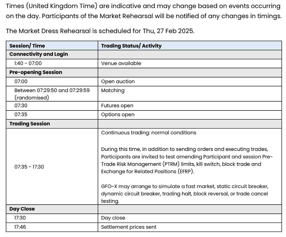 GFO-X is planning to conduct a market rehearsal on Feb 27 . During this test , clients can test their connectivity to exchange and also place orders and view execution reports .