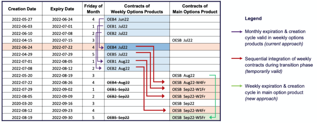 Starting 23 September 2022, Eurex will gradually integrate all weekly expiring contracts OES1/OES2/OES4/OMSX into the standard option OESX. Please find below the detailed migration schedule:
